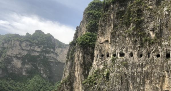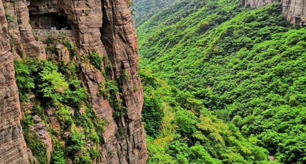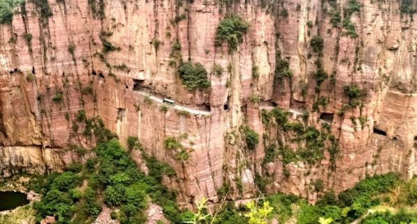 昆山位于太行山的东南,是山西与河南在此垂直分开之地,千仞峭壁环列,险峰巨石峥嵘,被称为绝壁胜地。隧道公路为这里的三绝之一。昆山隧道从绝对高度约500 米的悬崖上当腰穿过,近10 米左右开一“天窗”,透光而入,可窥见洞外云蒸霞蔚,拐弯处回头观望,“天窗”一字排开,上罩危壁,下临深渊,让人惊魂骇魄,叹为观止。另外两绝分别是山光水色和溶洞奇观。从王莽岭游完到郭亮景区需要穿越昆山隧道的挂壁公路。昆山隧道并不长,很容易走完,跟郭亮洞很相似。