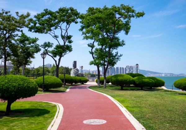 威海市海源公园地处合庆湾,长890米,占地7.52万平方米。公园主要由临海广场、观海平台、山石及人工建筑小品、自然甬路和休闲广场5部分组成。