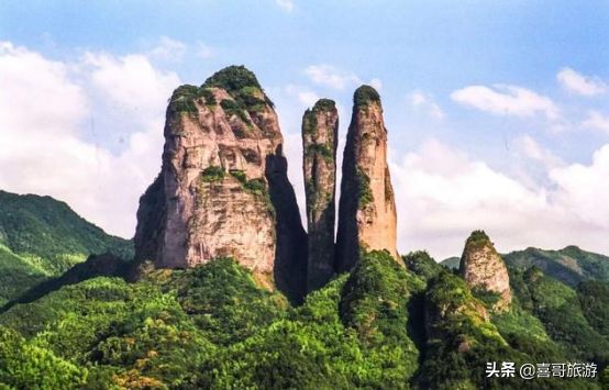 【江郎山风景区】位于浙江省衢州市江山市石门镇江郎乡余家坞村。景区为国家级重点风景名胜区和国家级5A级景区,由三爿石、十八曲、塔山、牛鼻峰、须女湖(青龙湖 曾用名)和仙居寺等部分组成,面积11.86平方公里,景观类型以自然景观为主,同时也有丰富的人文景观。