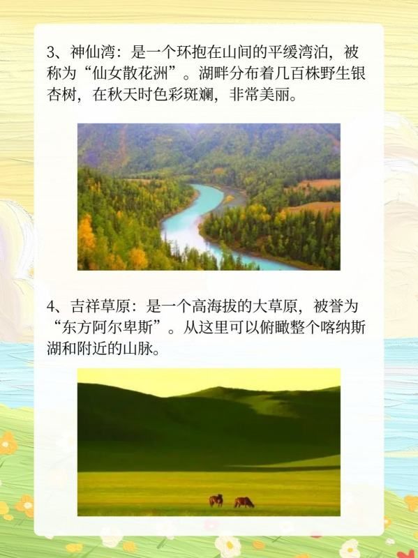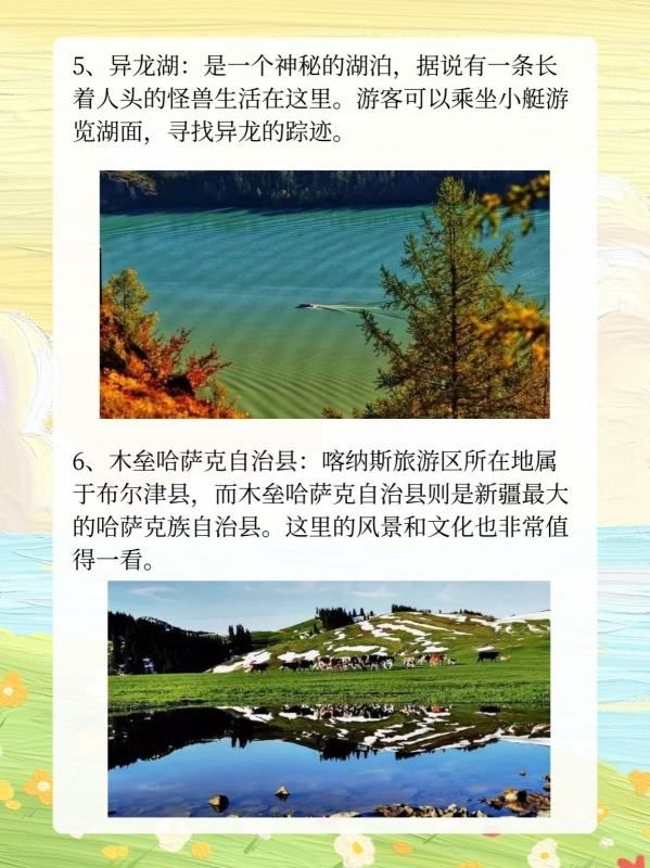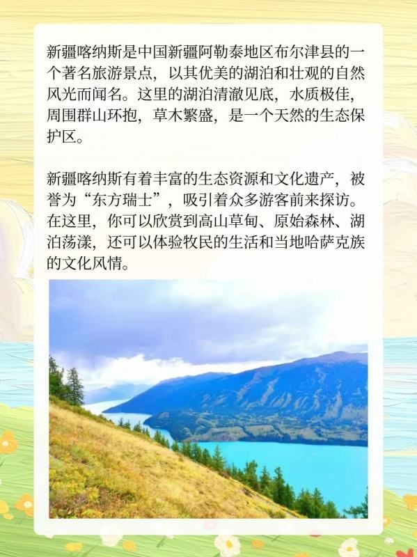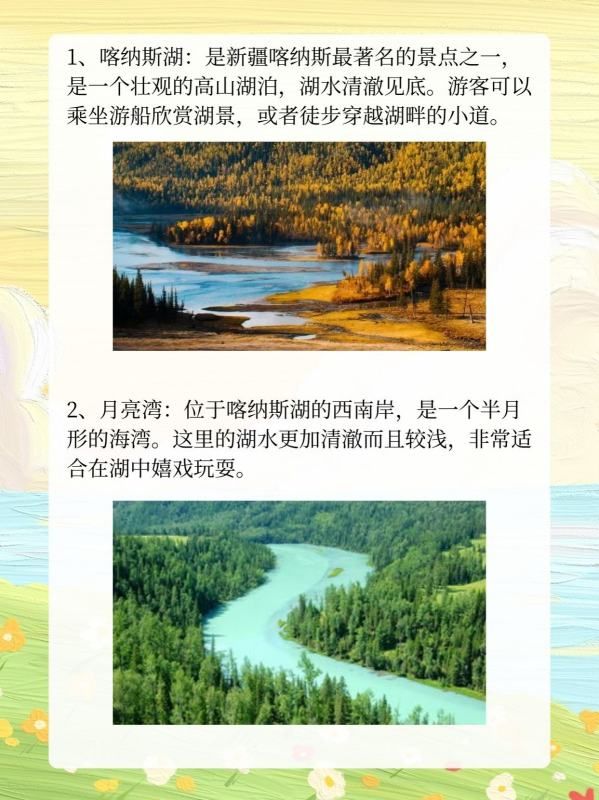 总之,喀纳斯作为中国最著名的旅游胜地之一,有着独特的自然风光、丰富的文化历史,以及美味的美食,都可以为游客带来难忘的旅行体验,值得游客前去一探究竟。