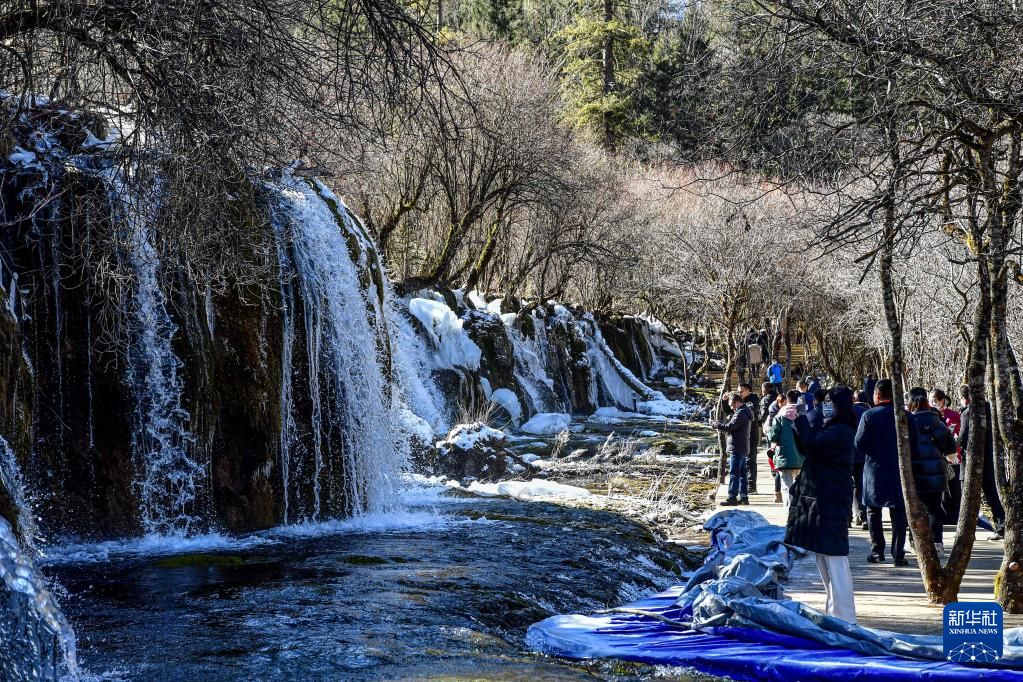 1月5日,游客在观赏九寨沟景区内的箭竹海瀑布。 新华社记者张超群 摄