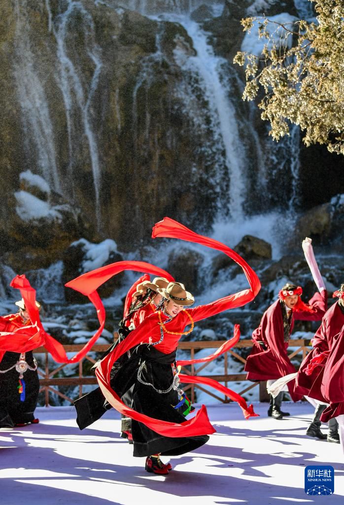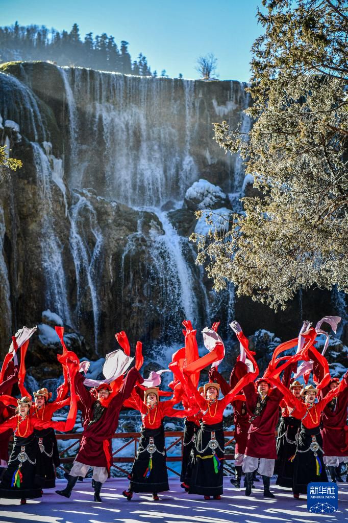 1月5日,演员在中国九寨沟第十七届国际冰瀑旅游节上跳起具有民族特色的舞蹈。 新华社记者 张超群 摄