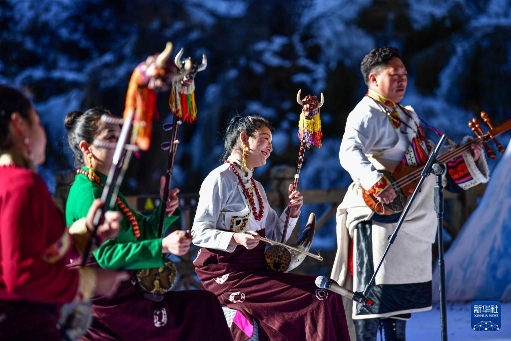 1月5日,表演者在中国九寨沟第十七届国际冰瀑旅游节上演奏传统藏族乐器。 新华社记者 张超群 摄