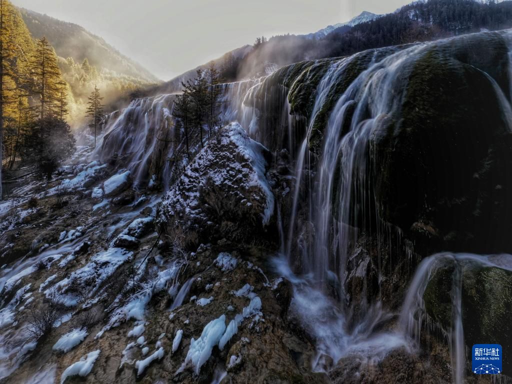 这是九寨沟景区内的珍珠滩瀑布冬景(1月5日摄)。 1月5日,中国九寨沟第十七届国际冰瀑旅游节在四川九寨沟景区珍珠滩瀑布前开幕,活动以“神奇九寨更迷人”为主题,展现了九寨沟景区地震灾后重建并全域恢复开放后迷人的冬季风光。开幕式上,演员以天然冰瀑为背景表演了多姿多彩的民族歌舞。新华社记者 张超群 摄