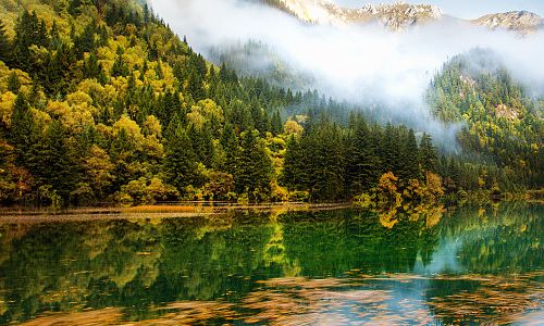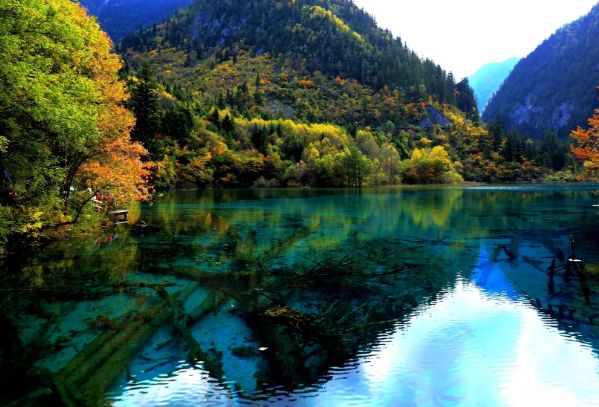 九月份四川九寨沟集翠海、叠溪、彩林、雪峰、藏族风情为一体,是中国最著名的旅游风景区。