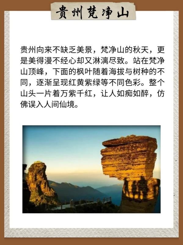 贵州向来不缺乏美景,梵净山的秋天,更是美得漫不经心却又淋漓尽致。站在梵净山顶峰,下面的枫叶随着海拔与树种的不同,逐渐呈现红黄紫绿等不同色彩。整个山头一片着万紫千红,让人如痴如醉,仿佛误入人间仙境。