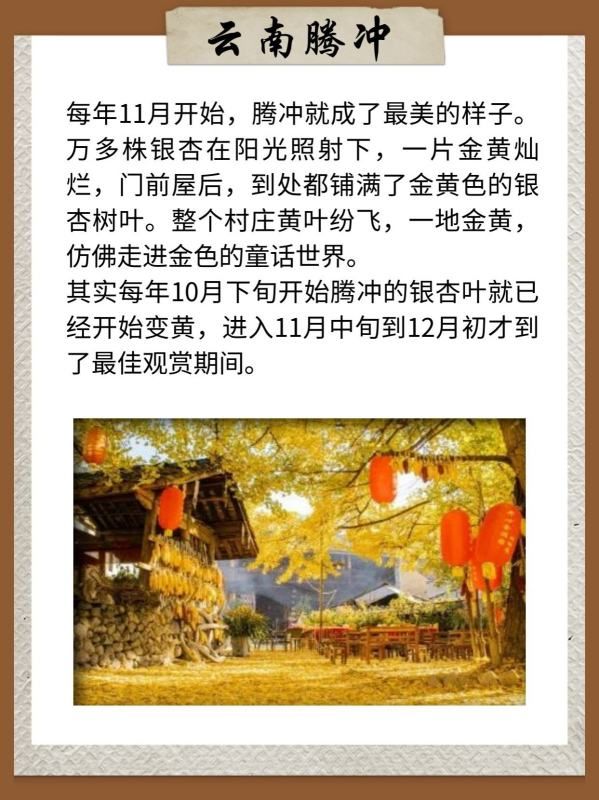 其实每年10月下旬开始腾冲的银杏叶就已经开始变黄,进入11月中旬到12月初才到了最佳观赏期间。