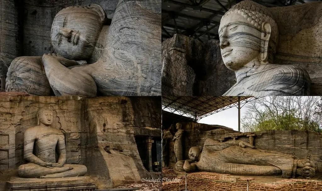 伽尔寺(Gal Vihara)以其大型群雕佛像驰名,包括前后相连的三大佛像和一座佛龛,均为一整块巨型花岩石上雕刻而成,是波隆纳鲁沃时期的典型作品。佛陀卧像长达14.12米,面容安详,略带笑意,而另一尊佛陀立像高6.93米,双手交叉在胸前,面容哀苦,表现了悲悯众生的情怀 ~