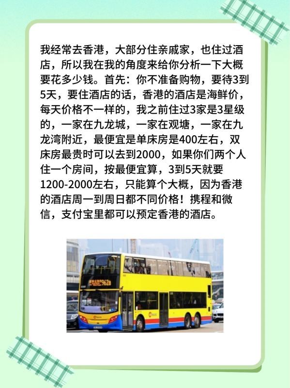我经常去香港,大部分住亲戚家,也住过酒店,所以我在我的角度来给你分析一下大概要花多少钱。首先:你不准备购物,要待3到5天,要住酒店的话,香港的酒店是海鲜价,每天价格不一样的,我之前住过3家是3星级的,一家在九龙城,一家在观塘,一家在九龙湾附近,最便宜是单床房是400左右,双床房最贵时可以去到2000,如果你们两个人住一个房间,按最便宜算,3到5天就要1200-2000左右,只能算个大概,因为香港的酒店周一到周日都不同价格!携程和微信,支付宝里都可以预定香港的酒店。