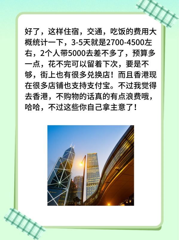 好了,这样住宿,交通,吃饭的费用大概统计一下,3-5天就是2700-4500左右,2个人带5000去差不多了,预算多一点,花不完可以留着下次,要是不够,街上也有很多兑换店!而且香港现在很多店铺也支持支付宝。不过我觉得去香港,不购物的话真的有点浪费哦,哈哈,不过这些你自己拿主意了!