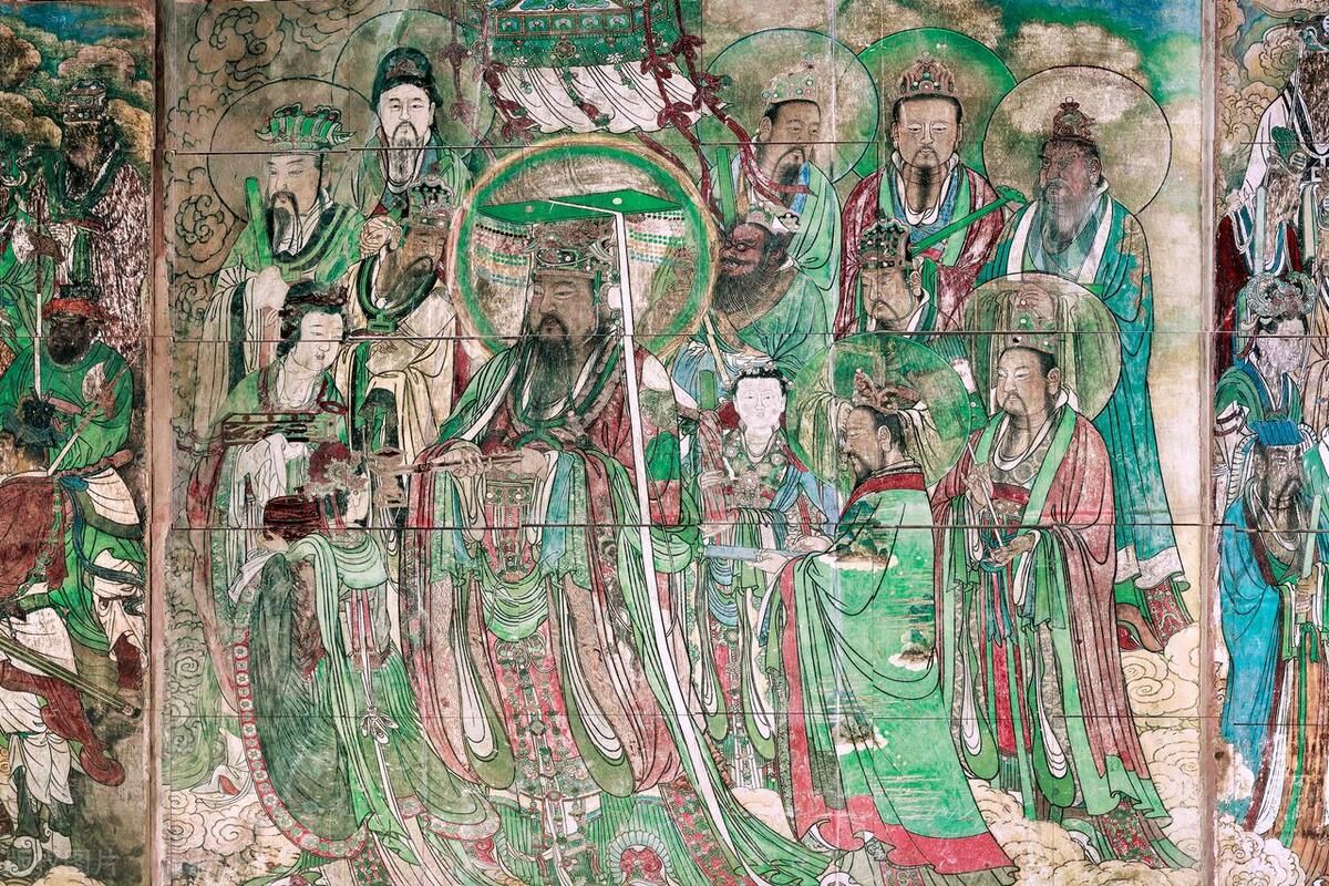 同样栩栩如生的还有永乐宫里的《朝元图》,堪称“元代壁画艺术的最高典范”。描绘了诸神朝拜元始天尊的故事,以8 个帝后主像为中心,周围有金童、玉女、星宿、力士等共286 尊,场面开阔,气势恢宏。且画作用线自然,运笔流畅,衣袂翻飞似无风而动,颇具“吴带当风”之遗韵,活灵活现,仿若近在眼前。