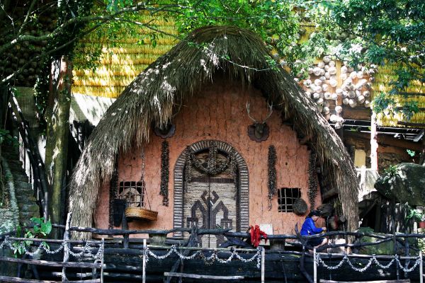 五指山黎寨自然村位于通什市郊,沿着南圣河北岸走2公里便是。这儿周围群山滴翠,田畴连片,一派田园风光,是黎胞聚居的自然村。原是“合亩制”的村落,尚成片地保留着传统的船形茅屋。