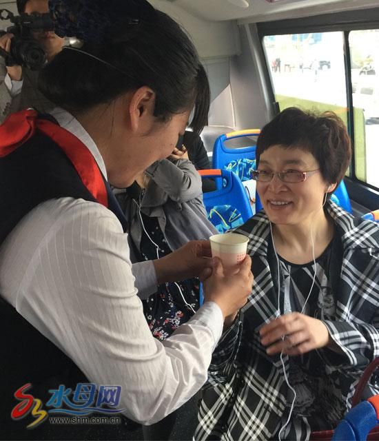 记者发现乘务员其实还兼职导游,实行航空式服务,除了为每名游客提供景点介绍、景点优惠门票预售、特殊群体照顾外,还随时为市民提供免费的饮用水。