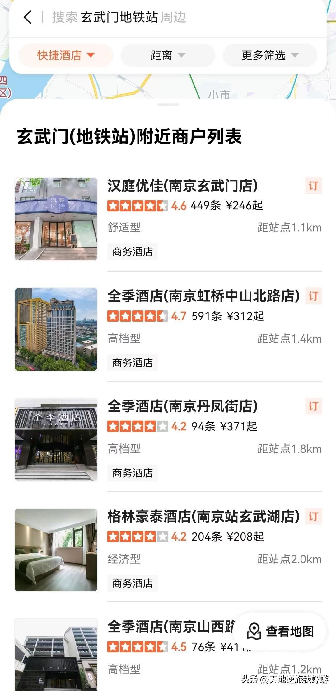 玄武门地铁站附近就是玄武湖景区,也可以沿着玄武湖游览5A级的钟山风景区,附近有狮子桥美食街,众多南京特色的小吃,游览景区、品尝美食也很方便。玄武门地铁站附近酒店很多,你可以在大众点评或者美团输入玄武湖地铁站,查找周围的酒店,比如快捷酒店,有很多可选: