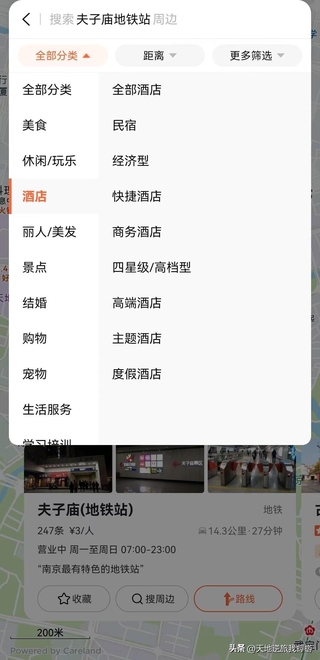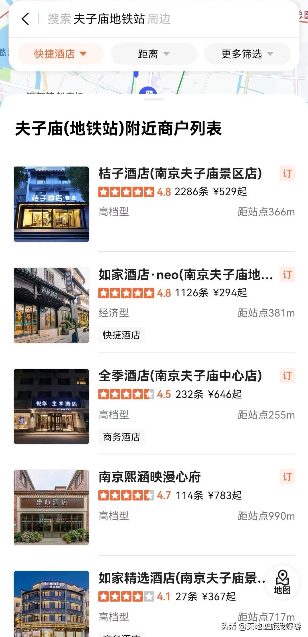夫子庙地铁站附近就是夫子庙-秦淮河风光带这一5A级景区,附近有众多南京特色的小吃,游览景区、品尝美食都非常方便。夫子庙地铁站附近酒店很多,你可以在大众点评或者美团输入夫子庙地铁站,查找周围的酒店,比如快捷酒店,有很多可选: