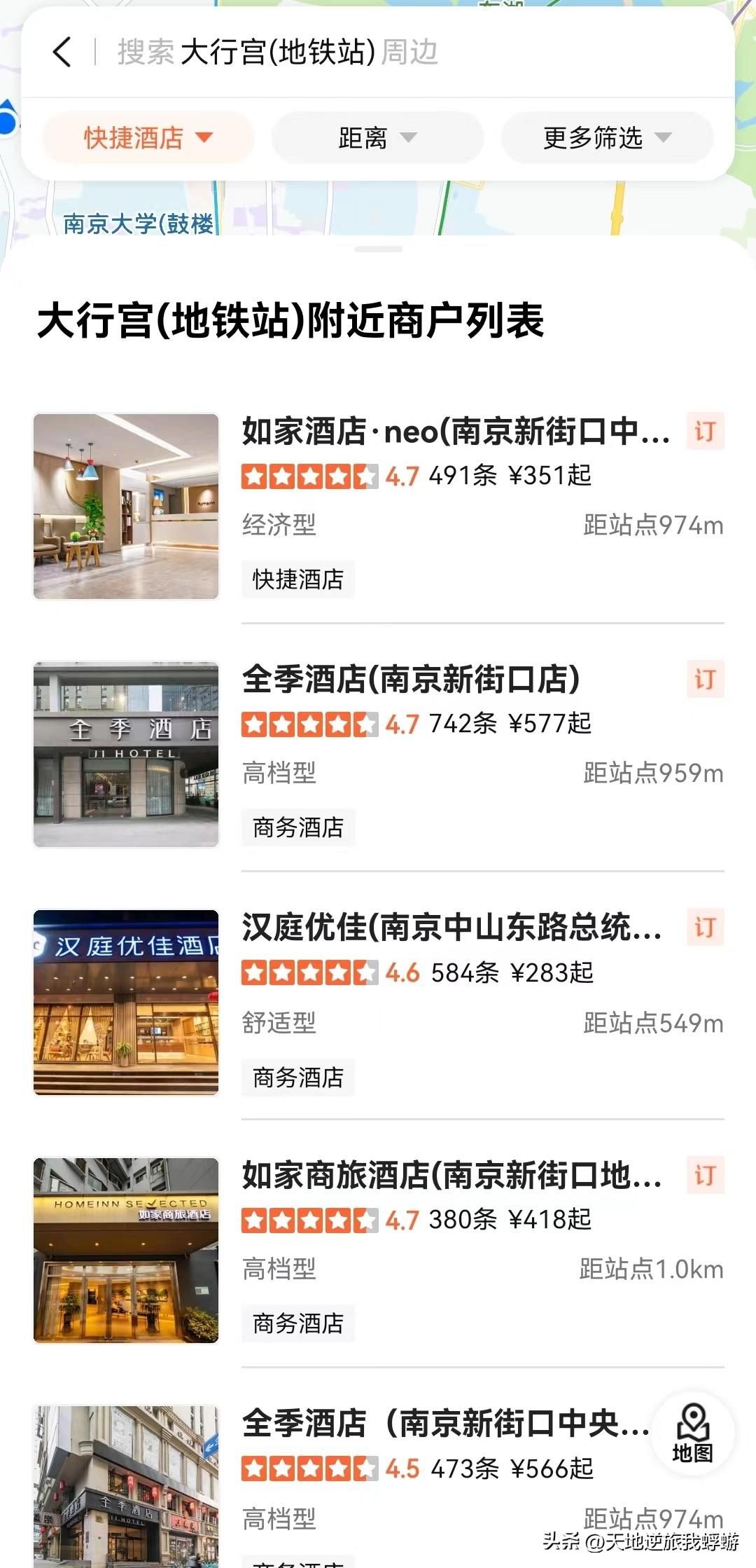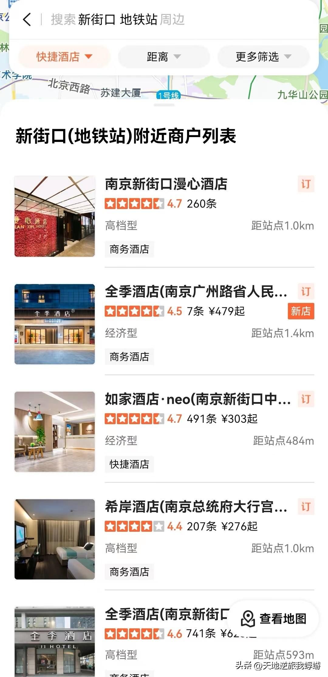 新街口是南京市区的正中心,是南京第一商圈,同时也是地铁1号线和2号线的换乘站。吃饭、购物和游览出行都很方便。新街口地铁站附近酒店很多,你可以在大众点评或者美团输入玄武湖地铁站,查找周围的酒店,比如快捷酒店,有很多可选: