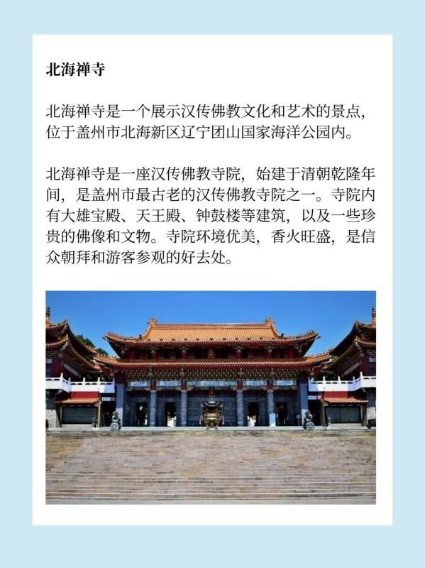 北海禅寺是一座汉传佛教寺院,始建于清朝乾隆年间,是盖州市最古老的汉传佛教寺院之一。寺院内有大雄宝殿、天王殿、钟鼓楼等建筑,以及一些珍贵的佛像和文物。寺院环境优美,香火旺盛,是信众朝拜和游客参观的好去处。
