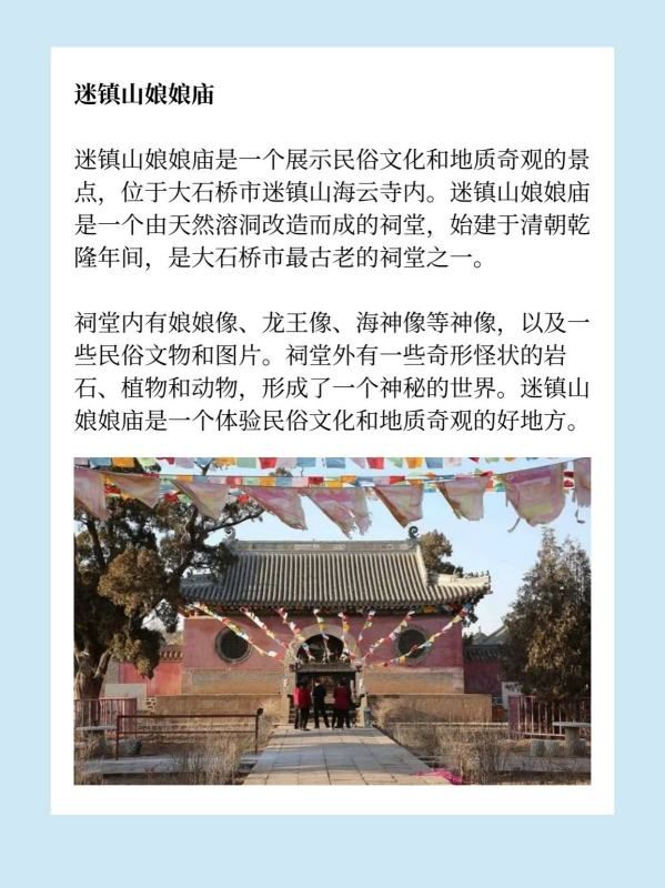 迷镇山娘娘庙是一个展示民俗文化和地质奇观的景点,位于大石桥市迷镇山海云寺内。迷镇山娘娘庙是一个由天然溶洞改造而成的祠堂,始建于清朝乾隆年间,是大石桥市最古老的祠堂之一。