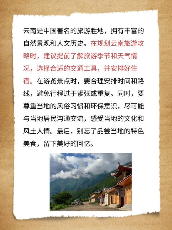 云南是中国著名的旅游胜地,拥有丰富的自然景观和人文历史。在规划云南旅游攻略时,建议提前了解旅游季节和天气情况,选择合适的交通工具,并安排好住宿。在游览景点时,要合理安排时间和路线,避免行程过于紧张或重复。同时,要尊重当地的风俗习惯和环保意识,尽可能与当地居民沟通交流,感受当地的文化和风土人情。最后,别忘了品尝当地的特色美食,留下美好的回忆。