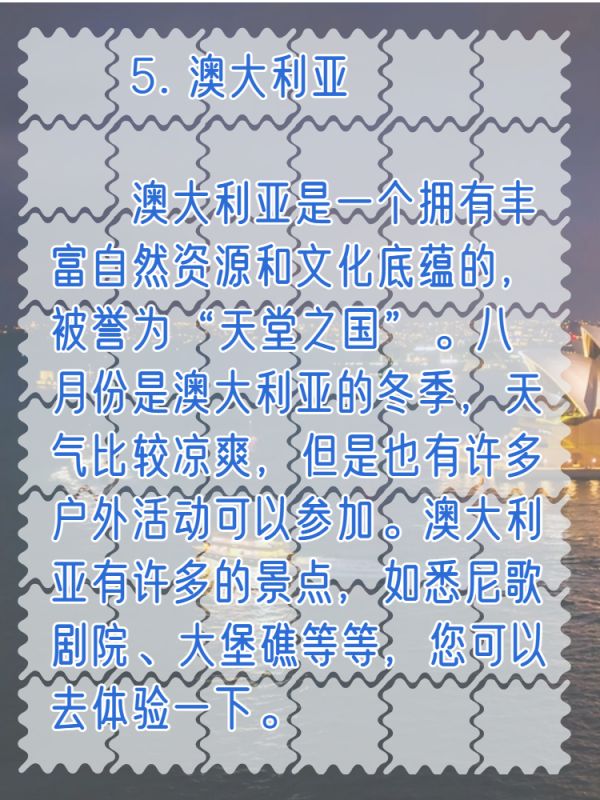 澳大利亚是一个拥有丰富自然资源和文化底蕴的,被誉为“天堂之国”。八月份是澳大利亚的冬季,天气比较凉爽,但是也有许多户外活动可以参加。澳大利亚有许多的景点,如悉尼歌剧院、大堡礁等等,您可以去体验一下。
