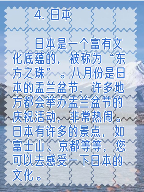 日本是一个富有文化底蕴的,被称为“东方之珠”。八月份是日本的盂兰盆节,许多地方都会举办盂兰盆节的庆祝活动,非常热闹。日本有许多的景点,如富士山、京都等等,您可以去感受一下日本的文化。