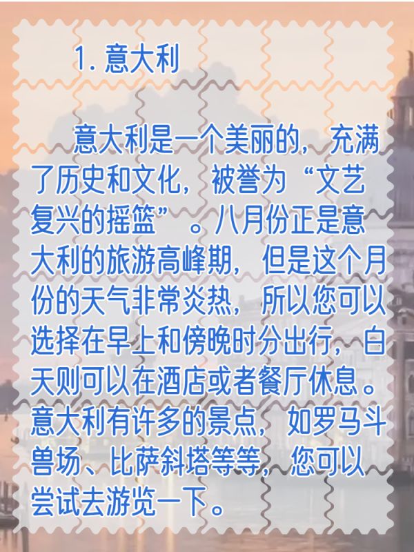意大利是一个美丽的,充满了历史和文化,被誉为“文艺复兴的摇篮”。八月份正是意大利的旅游高峰期,但是这个月份的天气非常炎热,所以您可以选择在早上和傍晚时分出行,白天则可以在酒店或者餐厅休息。意大利有许多的景点,如罗马斗兽场、比萨斜塔等等,您可以尝试去游览一下。