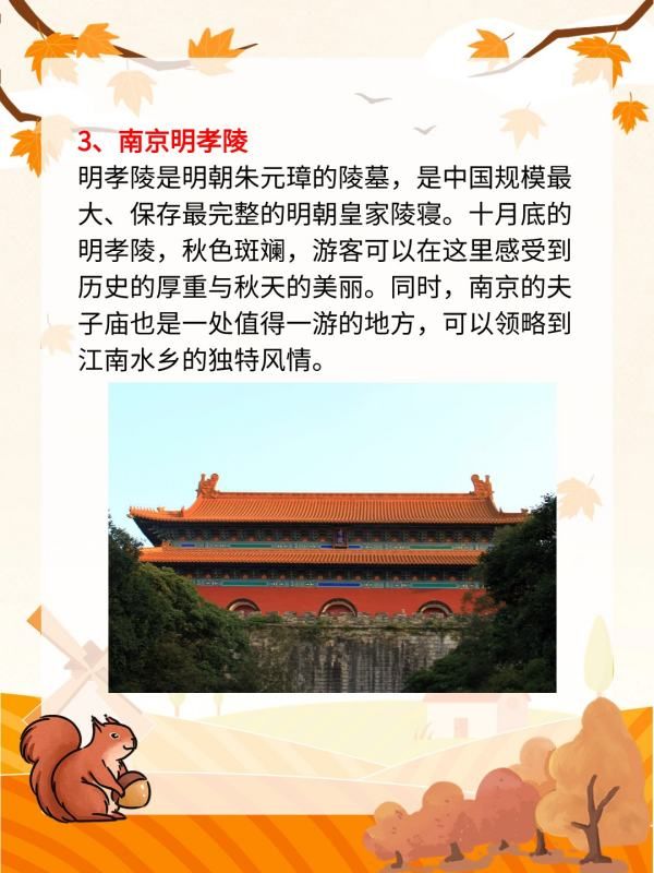 明孝陵是明朝朱元璋的陵墓,是中国规模最大、保存最完整的明朝皇家陵寝。十月底的明孝陵,秋色斑斓,游客可以在这里感受到历史的厚重与秋天的美丽。同时,南京的夫子庙也是一处值得一游的地方,可以领略到江南水乡的独特风情。