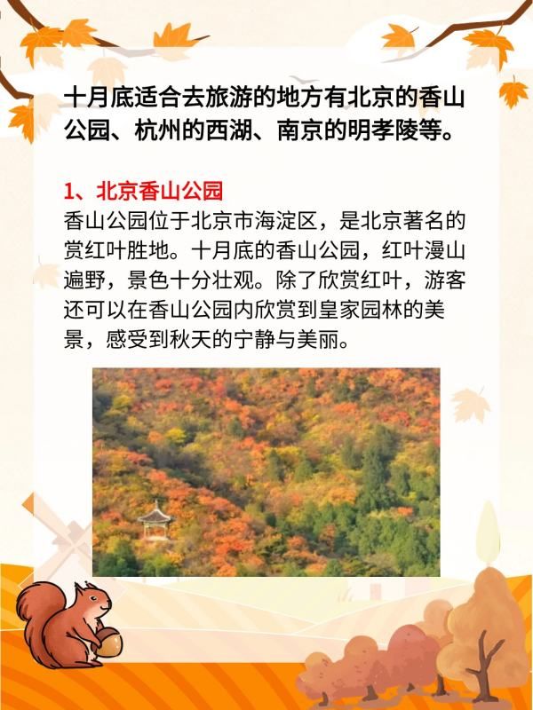 十月底适合去旅游的地方有北京的香山公园、杭州的西湖、南京的明孝陵等。