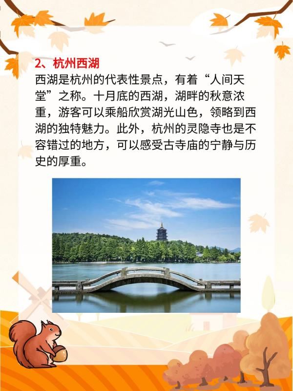 西湖是杭州的代表性景点,有着“人间天堂”之称。十月底的西湖,湖畔的秋意浓重,游客可以乘船欣赏湖光山色,领略到西湖的独特魅力。此外,杭州的灵隐寺也是不容错过的地方,可以感受古寺庙的宁静与历史的厚重。