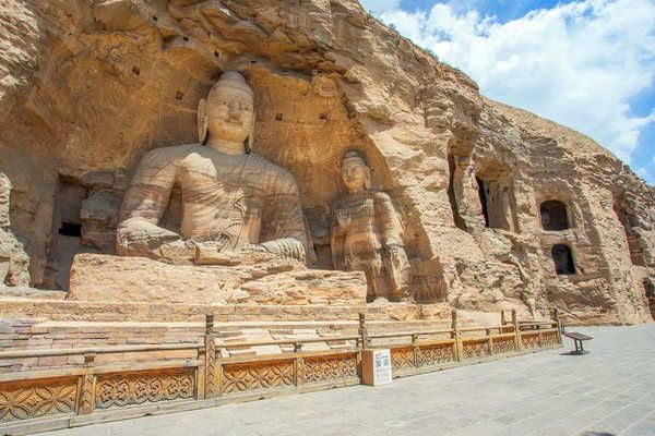 云冈石窟位于大同市西16公里的武周山麓,武州川的北岸。石窟依山开凿,东西绵延一公里。现存主要洞窟45个,计1100多个小龛,大小造像51000余尊,它是我国规模最大的石窟群之一,也是世界闻名的艺术宝库。