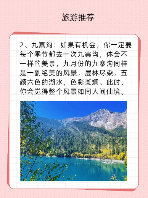 2、九寨沟:如果有机会,你一定要每个季节都去一次九寨沟,体会不一样的美景,九月份的九寨沟同样是一副绝美的风景,层林尽染,五颜六色的湖水,色彩斑斓。此时,你会觉得整个风景如同人间仙境。