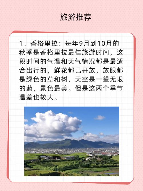 1、香格里拉:每年9月到10月的秋季是香格里拉最佳旅游时间,这段时间的气温和天气情况都是最适合出行的,鲜花都已开放,放眼都是绿色的草和树,天空是一望无垠的蓝,景色最美。但是这两个季节温差也较大。
