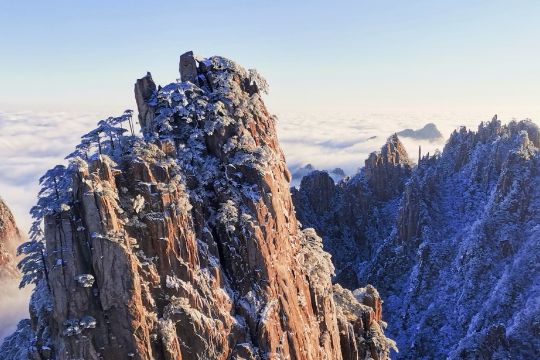 3、黄山:黄山冬天的风景壮丽而神秘,白雪覆盖的山峰和冰挂装饰的树枝构成了如画般的景象,云海在山间翻滚,仿佛仙境般梦幻。