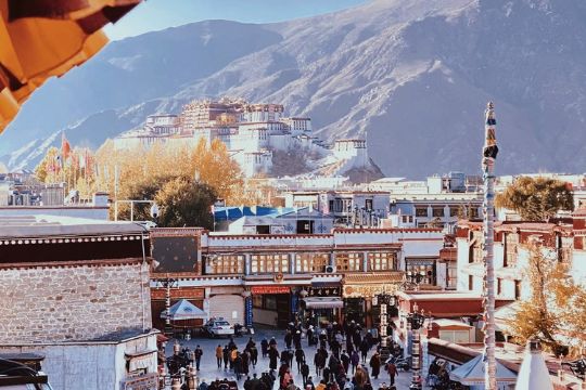 2、拉萨:寒冷的空气弥漫着神圣的气息,阳光在雪地上折射出耀眼的光芒。远处的雪山峭壁高耸入云,冰川在阳光下闪闪发光,与近处的布达拉宫交相辉映,构成了一幅绝美的画卷。