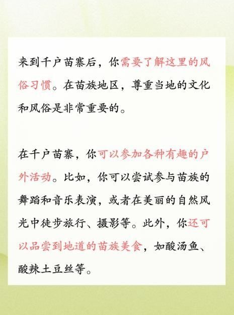 当然,来到千户苗寨后,你需要了解这里的风俗习惯。在苗族地区,尊重当地的文化和风俗是非常重要的。例如,在参观苗族民居时,记得不要随意进入主人家的卧室;在参加苗族活动时,要尊重当地的礼仪和规矩。这样,你才能更好地融入这里的生活。