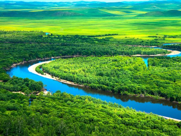 海拉尔一路下来都是辽阔大草原,呼伦贝尔牛羊马到处都是,这个季节草也很绿了。呼伦湖建议从高处欣赏,像一片蓝色海洋,山坡长满了小花,黄绿相间。满洲里山坡有不停翻转的风车,街上有金发碧眼的姑娘,商店里有精致鼎俄罗斯特产,国门里有英俊威武的守边士兵,国际铁路就是从这里开往俄罗斯。