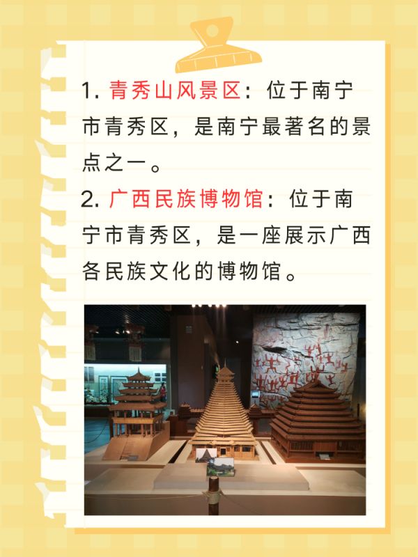 2. 广西民族博物馆:位于南宁市青秀区,是一座展示广西各民族文化的博物馆,展示了广西各民族的服饰、饮食、建筑、音乐、舞蹈等文化元素,是了解广西民族文化的好去处。