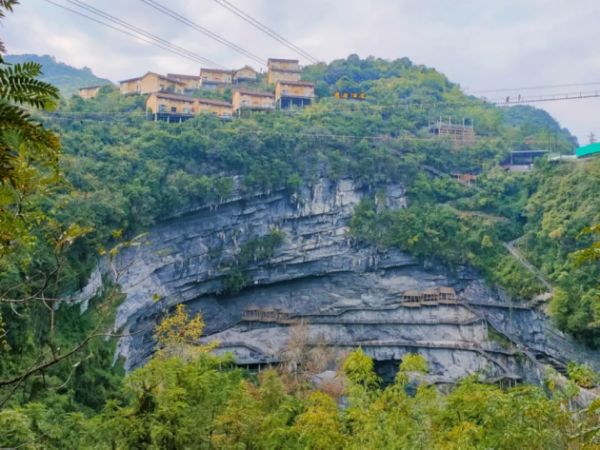 棉花天坑包括天坑大剧场、深洞古村落民宿、长生洞三大景点。天坑大剧场深约280米,宽约300米,全程悬崖栈道(悬崖看台)约800多米,可同时容纳观众3000多名。天坑中部为800多平米的中央大舞台,栈道及舞台形成剧场的可交换互动式场景,为游客提供更多的参与体验。坑中有悬崖酒店、天梯、滑索、攀岩(飞拉达)、悬崖秋千、悬崖裂缝上的玻璃栈道。