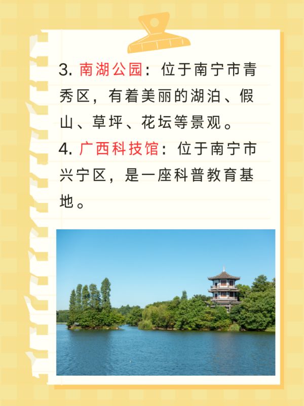 3. 南湖公园:位于南宁市青秀区,是一座美丽的城市公园,有着美丽的湖泊、假山、草坪、花坛等景观,是市民休闲娱乐的好去处。