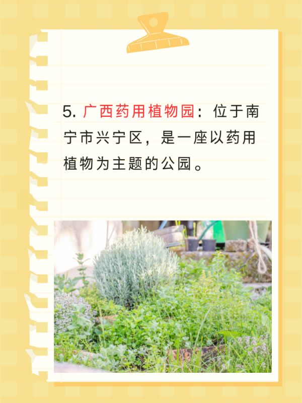 5. 广西药用植物园:位于南宁市兴宁区,是一座以药用植物为主题的公园,有着丰富的药用植物资源和优美的自然风光,是学习和了解药用植物的好去处。