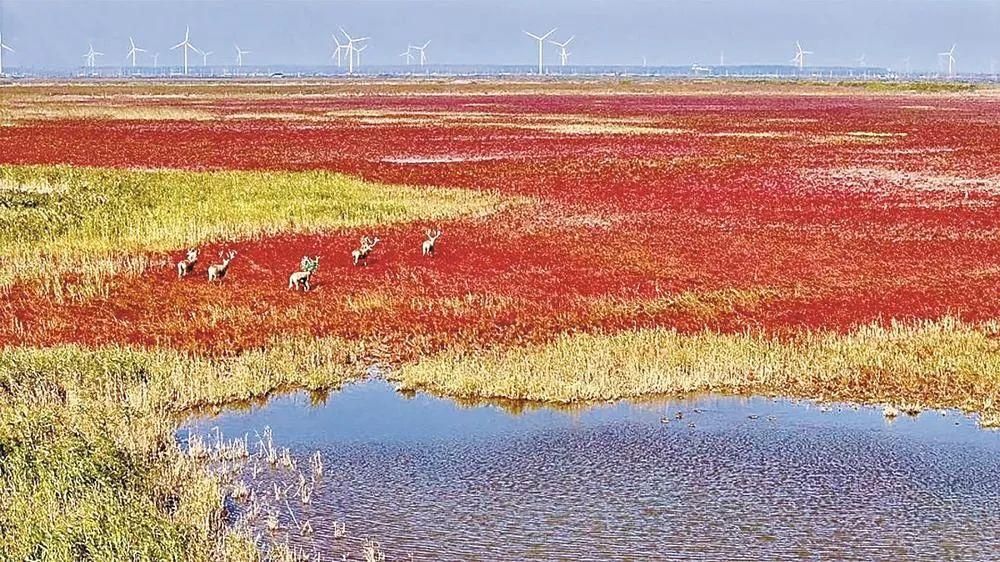 一簇簇火红的盐蒿草连绵铺展,造就了这个季节最惊艳的景致,给美丽海湾披上了成片锦绣。迁徙候鸟和野生麋鹿,是红毯上跃动的精灵,充满了生机和野趣,盐蒿织就了鸟与兽的奇妙相遇,和谐之美,尽在湿地。