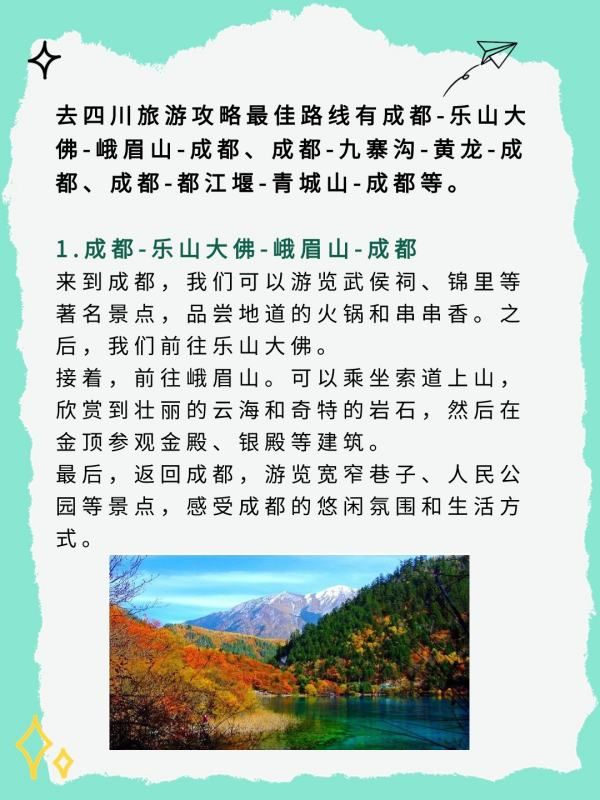 我之前去四川旅游觉得最佳路线有成都-乐山大佛-峨眉山-成都、成都-九寨沟-黄龙-成都、成都-都江堰-青城山-成都等。