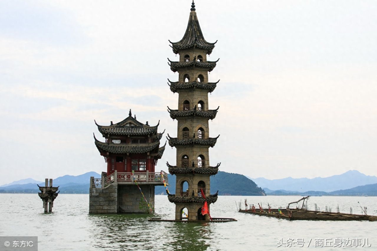 鄱阳湖 江西九江,中国最大淡水湖鄱阳湖持续超警戒水位,湖中心落星石被淹没,石上牌坊、亭、楼景观被淹,石上古塔虽然被淹一半,依然挺立不倒。(图片来自东方IC)