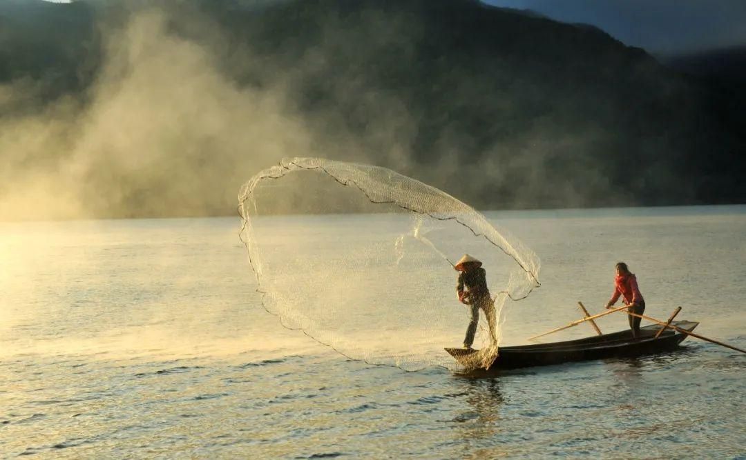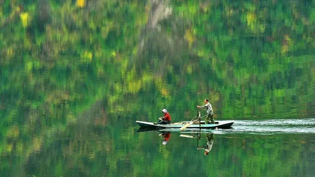 碧波千里,渔船在江上缓缓摇晃前行,这大概就是“远看山有色、近听水无生”的意境。