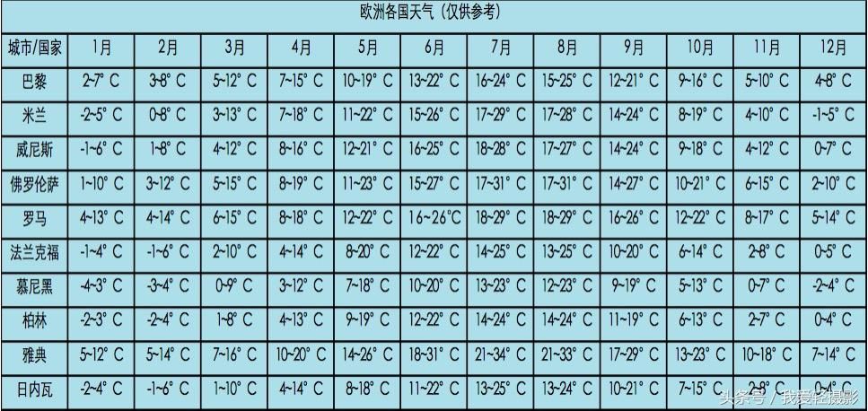 三,天气情况和带什么衣服去欧洲,这个需要看大概是几月份去旅游了,我们是7月中旬,气温和现在的上海的温度差不多,这里给大家一张欧洲各地全年气温平均图,供大家参考。