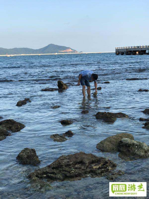 从酒店下去走六七分钟就是大东海了。大东海有礁石滩,有跳跳鱼,寄居蟹,小螃蟹,还有很漂亮的小鱼。这又是另一种乐趣。豆豆还抓到了一只大一点的螃蟹。