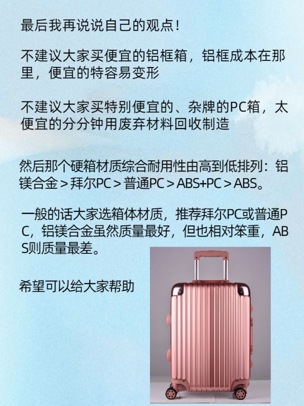 然后那个硬箱材质综合耐用性由高到低排列:铝镁合金>拜尔PC>普通PC>ABS+PC>ABS。