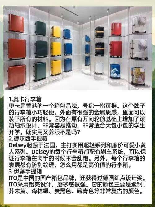 奥卡是香港的一个箱包品牌,号称一指可推。这个牌子的行李箱小巧轻便,外面有很强的金属质感,里面可以装下所有的材料。因为在原有万向轮的基础上增加了滚动轴承设计,非常容易推动,非常适合大包小包的学生开学。既实用又养眼不是吗?