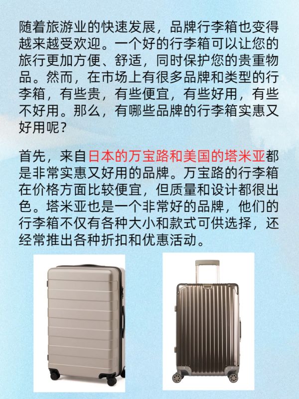 随着旅游业的快速发展,品牌行李箱也变得越来越受欢迎。一个好的行李箱可以让您的旅行更加方便、舒适,同时保护您的贵重物品。然而,在市场上有很多品牌和类型的行李箱,有些贵,有些便宜,有些好用,有些不好用。那么,有哪些品牌的行李箱实惠又好用呢?