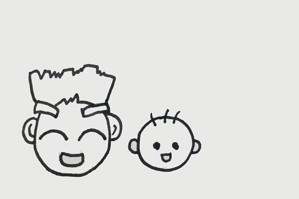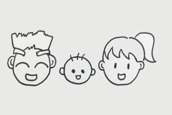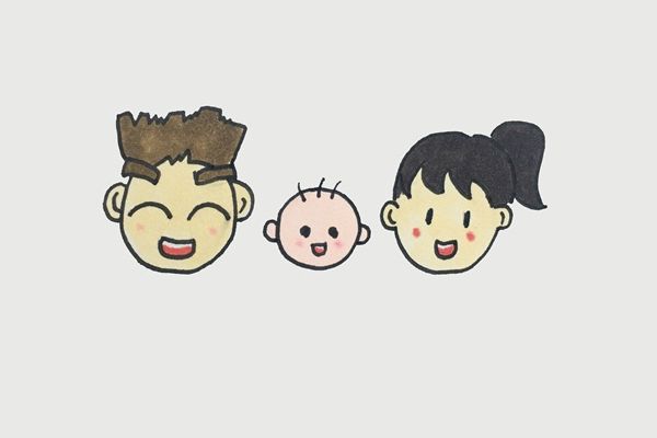 首先画出一家人中爸爸的脸,往上画出爸爸的头发,爸爸的头发要画出坚硬的感觉,然后画出爸爸脸上的眼睛、眉毛、嘴巴和耳朵,接着画出宝宝的头,再画出妈妈的头,妈妈扎着马尾辫,笑得非常开心,最后给一家人的面部涂肤色,头发涂上棕色和黑色,一家人就画好了。